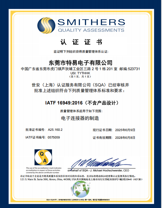 深圳市特易電子有限公司,成立2015年,是一家集研發、生產、銷售和服務為一體的連接器制造型企業。并于2020年設立東莞市特易電子有限公司為子公司。公司廠房面積6800平方米,擁有員工150余人。旗下設有五金沖壓部、注塑成型部、載帶包裝部、自動組裝部等多個組裝部門。配備了精密沖床15臺、臥式注塑機15臺、立式注塑機10臺、自動載帶機10臺、自動組裝機80多臺及眾多先進檢測設備。同時,凝聚了一批高素質的研發人員和生產技術人員。公司產品類型豐富多樣,覆蓋排針、排母、WAFER 插座、FPC連接器、FFC軟排線、刀式電池座、板對板連接器、開關系列、TYPE-C/USB插座、汽車連接器和電子線束等。所有產品均符合 ROHS、REACH 環保標準,工廠已通過 ISO9001:2015 認證、IATF16949 認證。